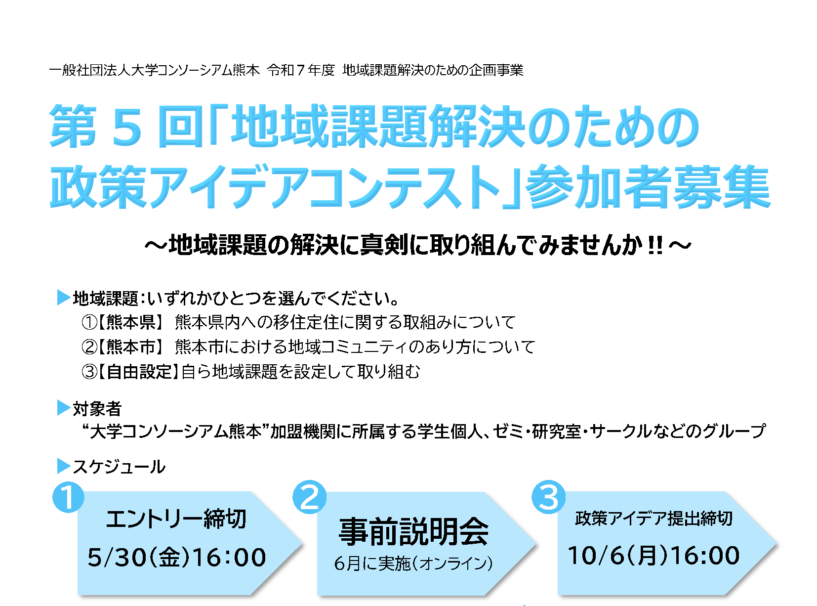 大学コンソーシアム熊本(以下コンソ熊本) 地域創造部会主催、「地域課題解決のための政策アイデアコンテスト」を実施します。