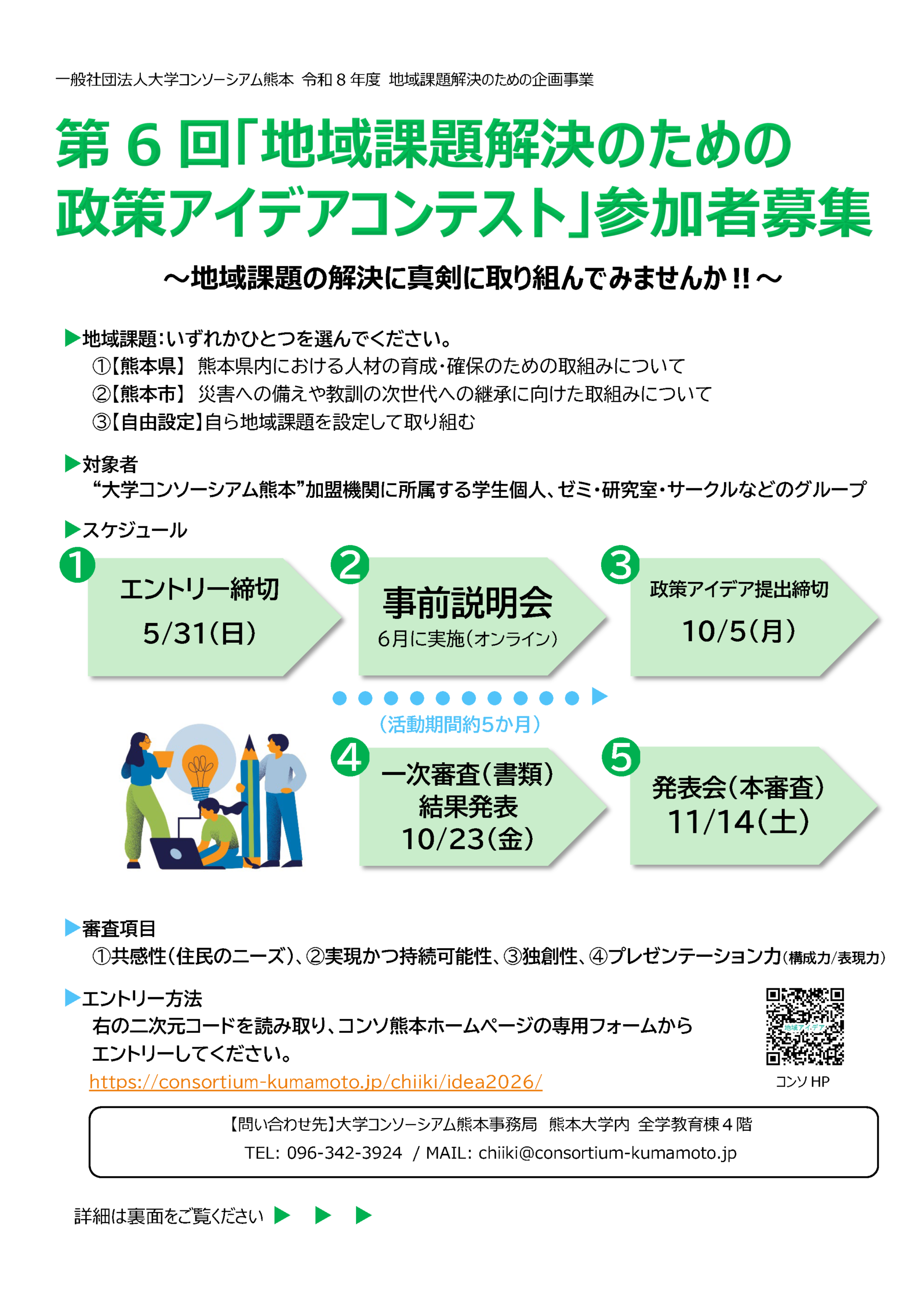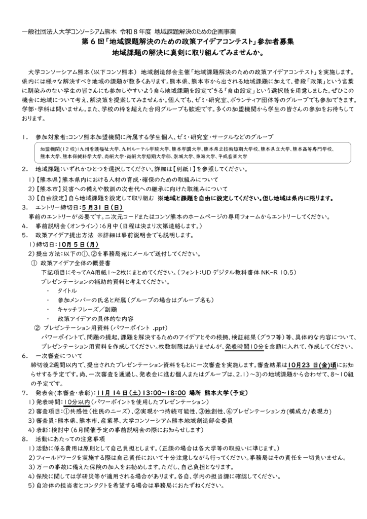 大学コンソーシアム熊本(以下コンソ熊本) 地域創造部会主催、「地域課題解決のための政策アイデアコンテスト」を実施します。