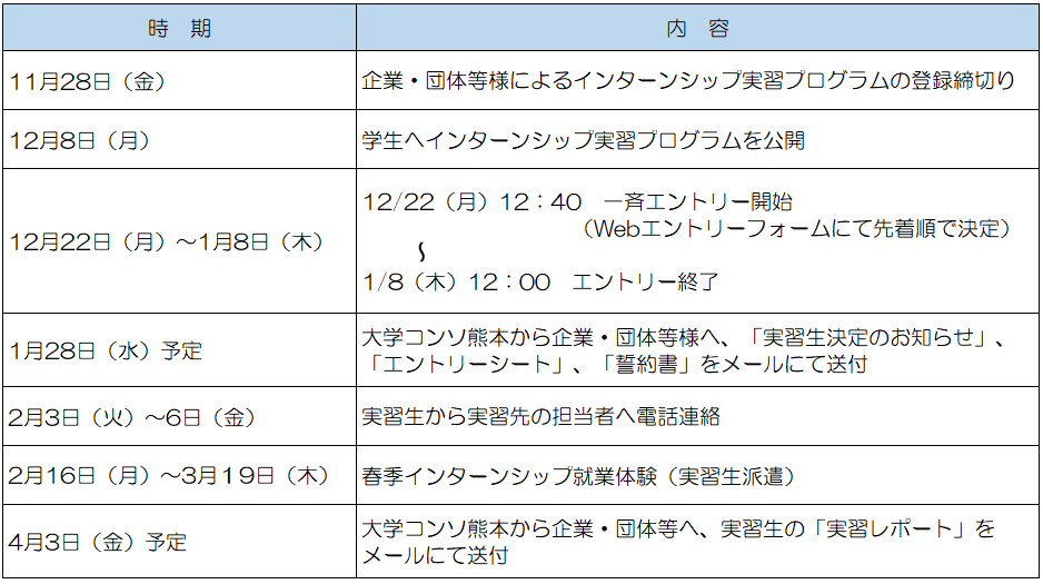 大学コンソーシアム熊本では、以下のスケジュールで令和7年度春季インターンシップ・プログラムを実施いたします。