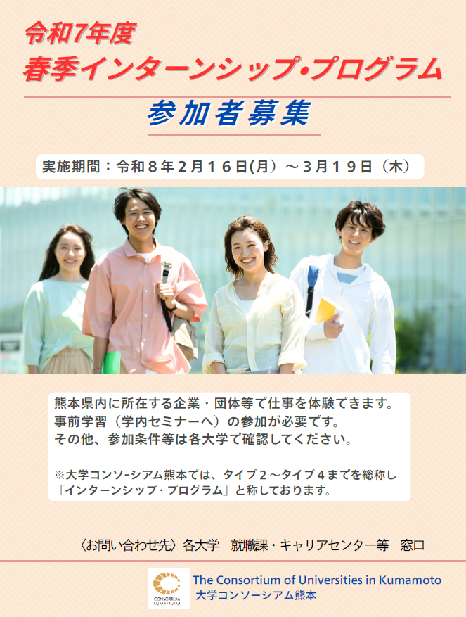 大学コンソーシアム熊本では、以下のスケジュールで令和7年度春季インターンシップ・プログラムを実施いたします。