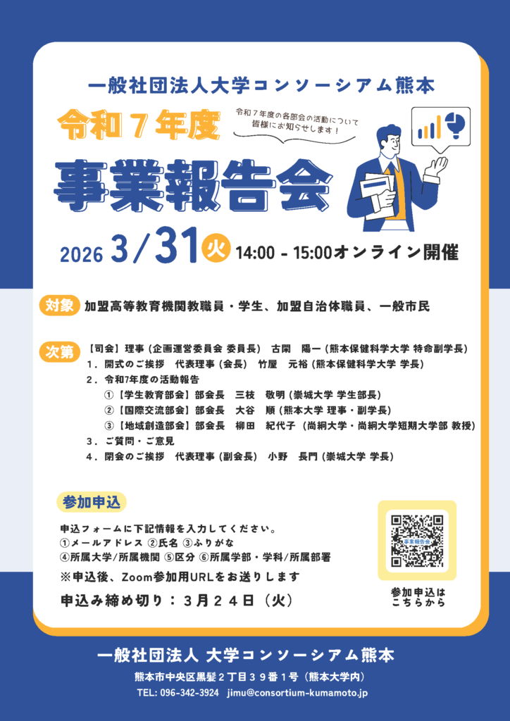 大学コンソーシアム熊本令和7年度事業報告会をオンラインで開催します。