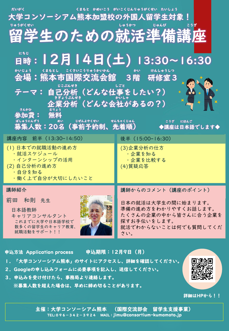 大学コンソーシアム熊本では、12月14日(土)に「留学生のための就活準備講座」を開催します。