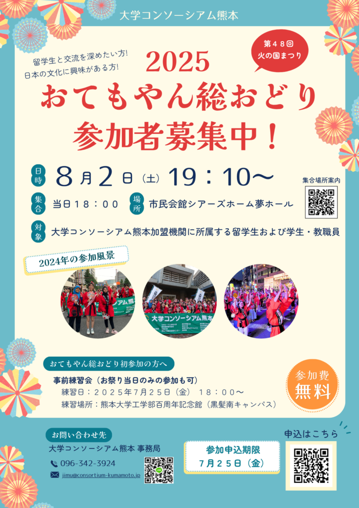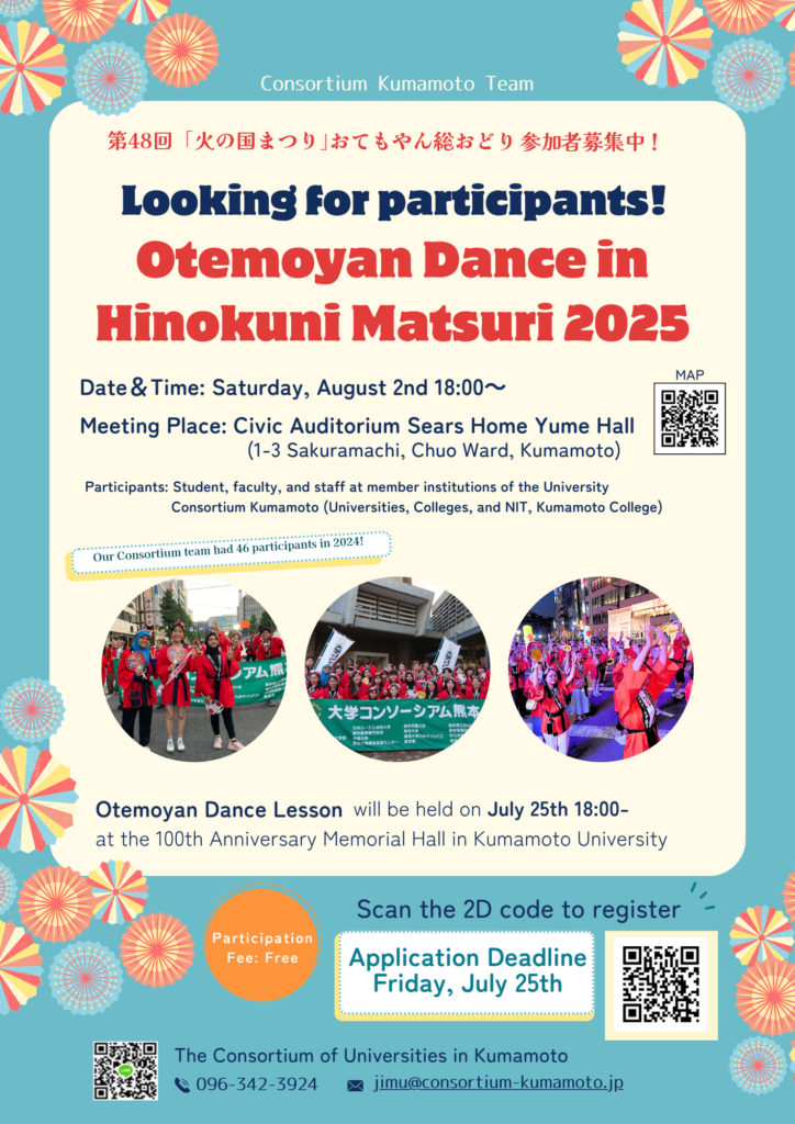 It’s announced that the 48th Hi-no-Kuni Festival will be held in August 2025. The Consortium Kumamoto has participated in the “Otemoyan So-Odori parade” held at the Hi-no-Kuni Festival every year since 2011.