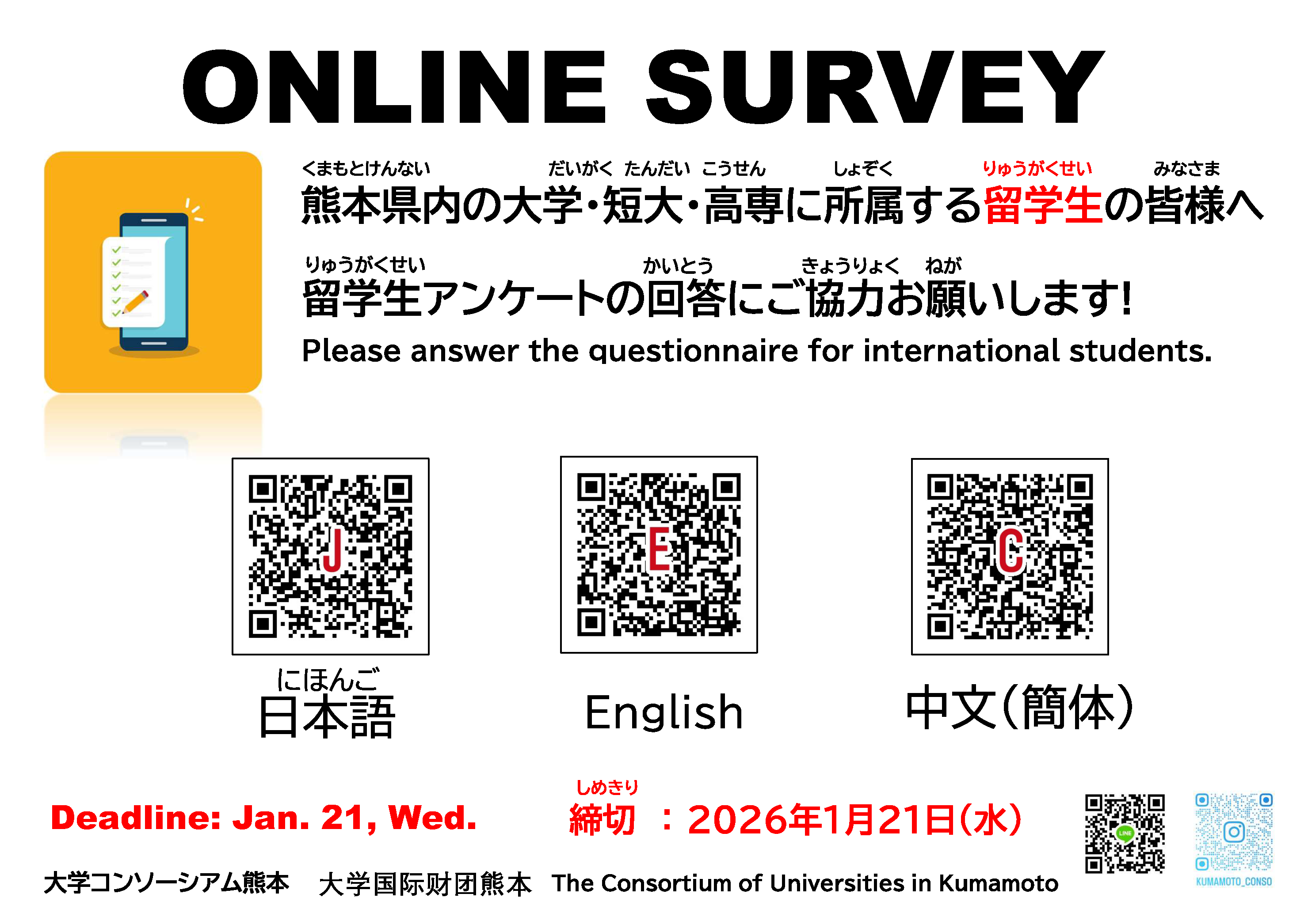 大学国际财团熊本将在县内各大学的合作下,针对外国留学生开展生活和就业状况的问卷调查。我们希望通过与各大学、熊本县、熊本市共享问卷结果,为留学生们创造一个更宜居、更易学习的环境。此外,为了改善即将来到熊本的留学生的生活环境,也请大家积极参与问卷调查。