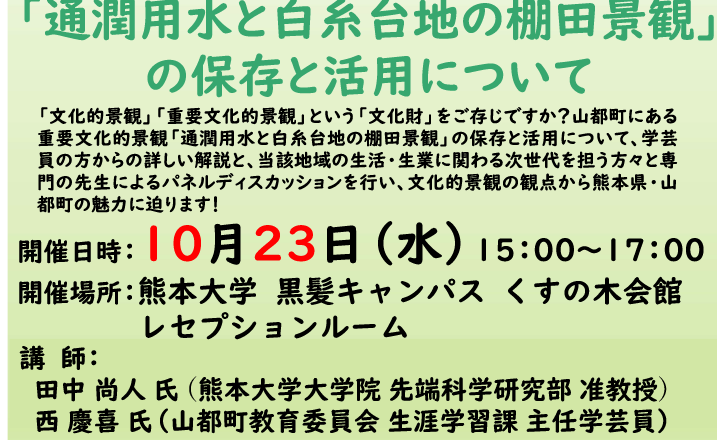 大学コンソーシアム熊本 地域創造部会(熊本魅力度UP事業 講演会) 開催日時:10月23日(水)15:00~17:00 講 演:重要文化的景観「通...