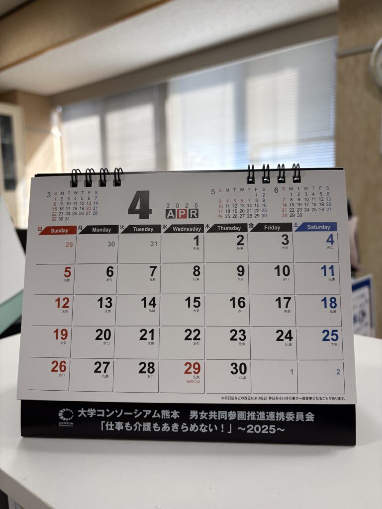 地域創造部会 男女共同参画推進連携事業 令和7年度 事業内容 男女共同参画を推進していくことを目的として、平成28年度に加盟機関で男女共同参画推進連携委員会を立ち上げ、講演会やセミナー等を企画・実施してきました。令和7年度も引き続き、男女共同参画に係る勉強会を企画・開催しました。 「介護セミナー」の開催 実 施 日:令和7年9月9日(火) 実施場所:熊本大学 黒髪北地区 くすの木会館レセプションルーム 対 象:男女共同参画推進連携委員会委員、加盟各機関に所属する関心を持つ教職員 参 加 者:20名 テ ー マ :「仕事と介護どちらもあきらめない」 講 師:田口 善信 先生(熊本市高齢者支援センター ささえりあ子飼 管理者・生活支援コーディネーター) 内 容: 仕事と介護の両立は、多くの人にとって大きな課題であり、これから突然の介護に困らないように、事前の心構えや準備を行う意識と知識を学ぶことを目的にセミナーを開催しました。「最期はどぎゃんする?」対話カードを使いグループで話し合い、また、熊本市が作成した「いまを生きる。あなたへ(メッセージノート)」が紹介され、人生の最終段階に受けたい医療やケアについて、自分自身の希望を前もって記録し周りに伝える大切さの説明がありました。今回のセミナーでは、参加者が当事者と人生の最終段階を気軽に話し合いながら、対話できる介護を目指したいという意識をもつ機会となりました。 介護に関する卓上カレンダーの作成と配布 令和7年度及び令和7度のテーマを「介護」として取り上げるにあたり、委員が継続した共通の意識を持ち続ける一助とするため、委員会名及び介護関連の文言を入れた卓上カレンダーを作成し、各加盟機関の適所へ設置しました。