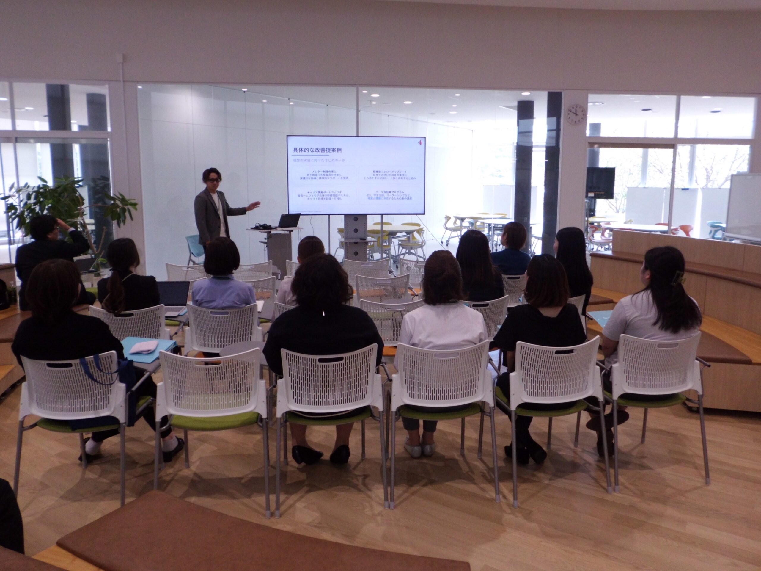 昨年度実施した、人材育成研修の目的・内容を踏まえて、1年間、組織の中で自ら取組んだことを発表・共有することで、気づきと振り返りの場とし、「人材育成」に関し、リーダーに求められる思考・意思決定・ディレクション等の新たな能力を養うことを目的として実施しました。