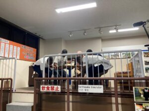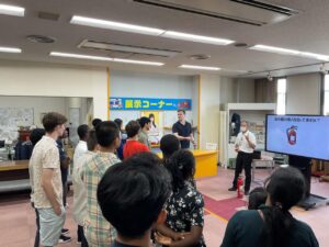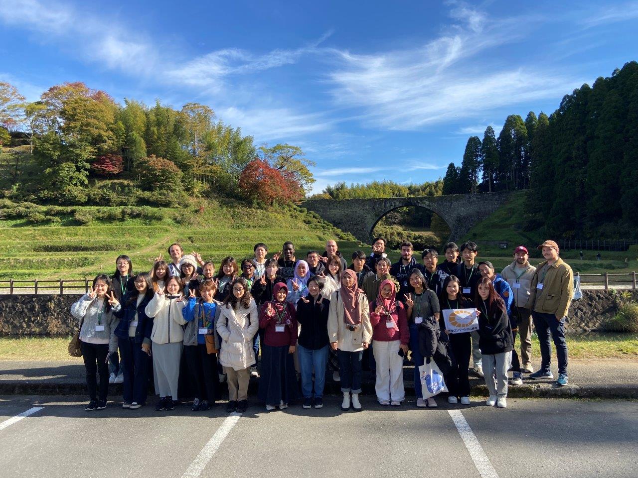 昨年、国宝に指定された「通潤橋」について学ぶため、上益城郡山都町に日帰りバスツアーを行った。往路は益城町総合運動公園に立ち寄り、漫画『ONE PIECE』のサンジ像を見学した。通潤橋史料館では、日本語と英語の説明を希望するグループに分かれて、見学を行った。担当者の案内で、通潤橋の歴史と水を運ぶ仕組みについて学ぶことができた。昼食の後、通潤橋の放水を見学し、近くの吊橋から五老ヶ滝を鑑賞した。道の駅通潤橋では地元のお酒や特産品などを購入し、各自でソフトクリームや軽食を買う学生もいた。休憩のあと、御船町に移動し、漫画『ONE PIECE』のブルック像と御船町恐竜博物館を見学した。迫力のある展示物を見学し、学生同士で展示について話しながら、館内を巡った。