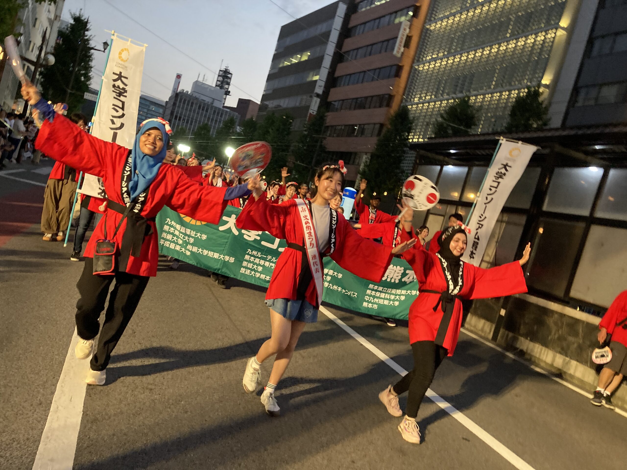 参加した学生たちは、練習の成果を発揮して元気よく踊り、熊本の夏祭りに参加できたことをとても喜んでいた。3人留学生が連代表として列の先頭を努めた。たいへんな暑さだったが、みんなで一体となって盛り上がり、熊本の思い出として楽しんでいた。祭りへの参加を通して熊本の文化を学び、学生同士の絆を深めることができた。