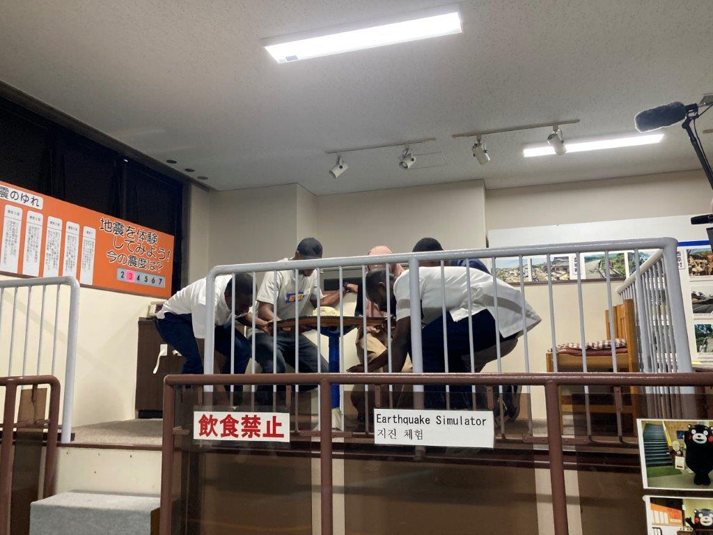 留学生に防災の知識を学び、日頃の防災意識を高めてもらうため、防災講座を実施した。熊本市広域防災センターの視聴覚室に集合し、熊本地震などの日本でおきた災害についてのビデオを鑑賞した。担当者の案内で、地震の震度1~7の揺れの体験、風速20 m/sの体験、火災の煙体験などを行った。熊本大学 大学教育統括管理運営機構 特任助教 アンドリュー ミッチェル先生にご参加いただき、講座全体の英語通訳と、ご自身が当時、留学生として経験した熊本地震についての解説をしていただいた。