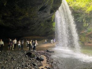 今年発行の新千円札の肖像に選ばれた、細菌学者であり、『近代日本医学の父』として知られる北里柴三郎について学ぶため、阿蘇郡小国町へ日帰りバスツアーを行った。北里柴三郎記念館では、北里柴三郎のひ孫にあたる北里英郎館長による「とっておきガイド」を堪能した。館長の流暢な英語によるガイドと、気さくな人柄で、終始和やかな雰囲気の中、北里柴三郎について学ぶことができた。小国町でそばの昼食を味わったのち、鍋ケ滝へ向かった。溶岩がつくる山の段差から、カーテンのように幅広く水が流れ落ちるさまを見学し、滝の裏側から滝を見るという貴重な体験をすることができた。