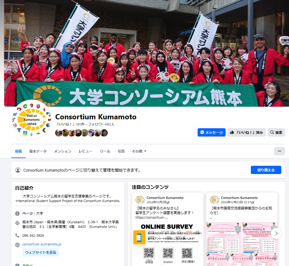 「Consortium Kumamoto」ページを主に英語での情報発信を行うことを目的として運営した。コンソや他機関の留学生向けのイベントや企画、県や市からのお知らせなどを掲載した。コンソホームページ「大学コンソーシアム熊本」の記事を掲載し、留学生に周知を行った。