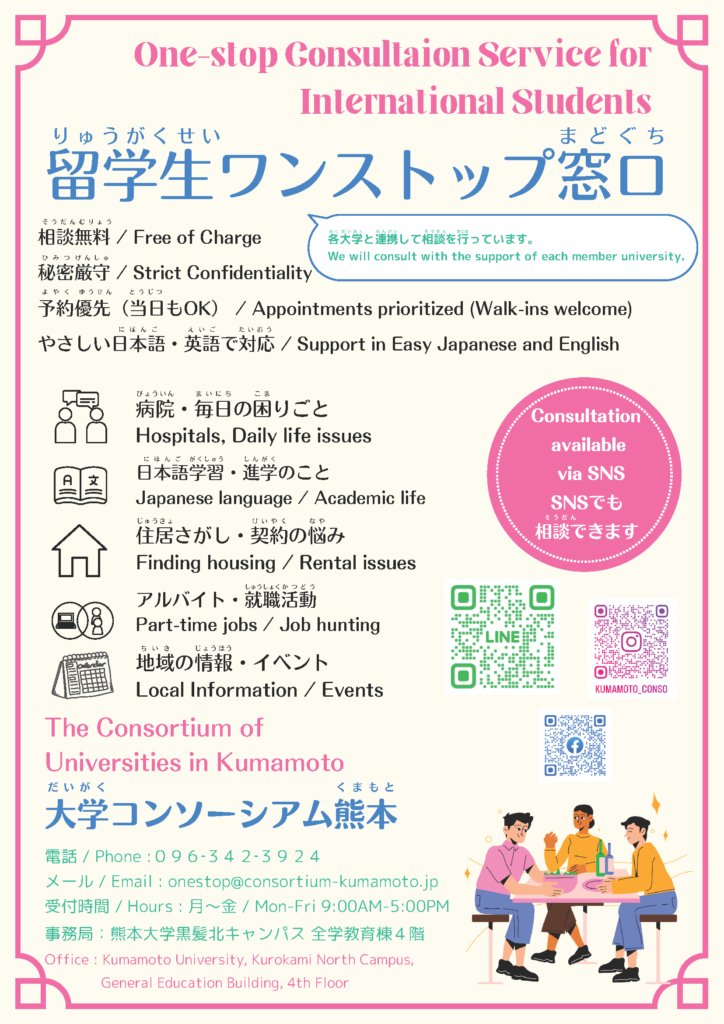 大学コンソーシアム熊本では、熊本県内の大学などに在籍する留学生のために「留学生ワンストップ窓口」を開設しております。留学生の皆様が抱えている様々な相談(生活、住居、就職、アルバイト、在留資格、ボランティアなど)を受付けております。ワンストップ窓口は、留学生の皆様が熊本で充実した留学生活を送るためにサポートを行っています。お気軽に皆さんのお話をきかせてください。