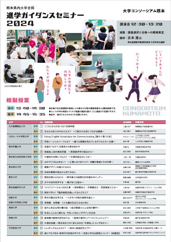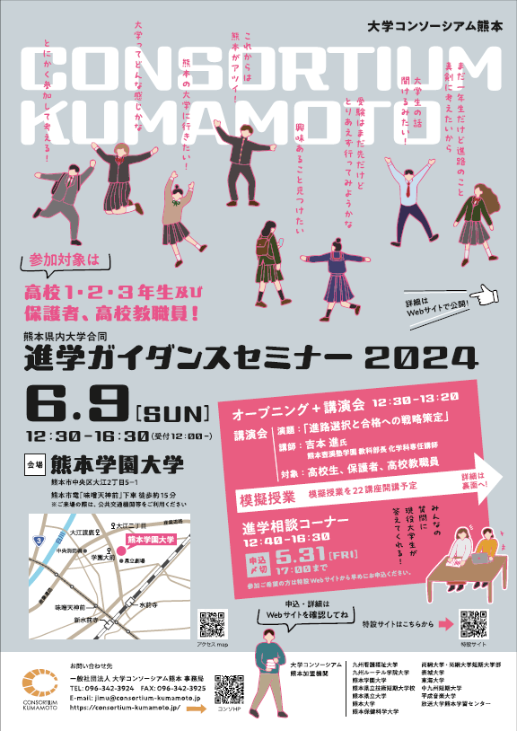 熊本の大学・高等教育機関で組織する大学コンソーシアム熊本(会長:細江守紀 熊本学園大学長)主催による進学ガイダンスセミナー2024を開催します。